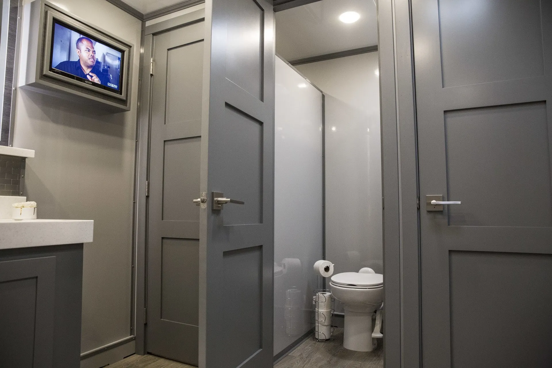 This is our newest restroom trailer for those extra special occasions or for supreme comfort. Truly bring the indoors out with this series; this has it all! We can accommodate any sized gathering.